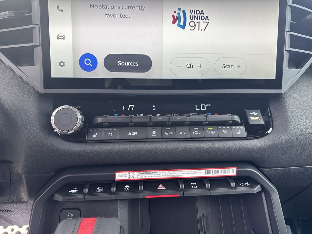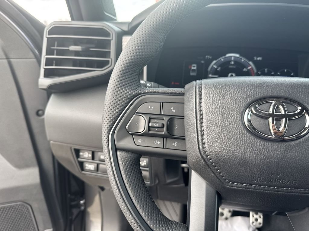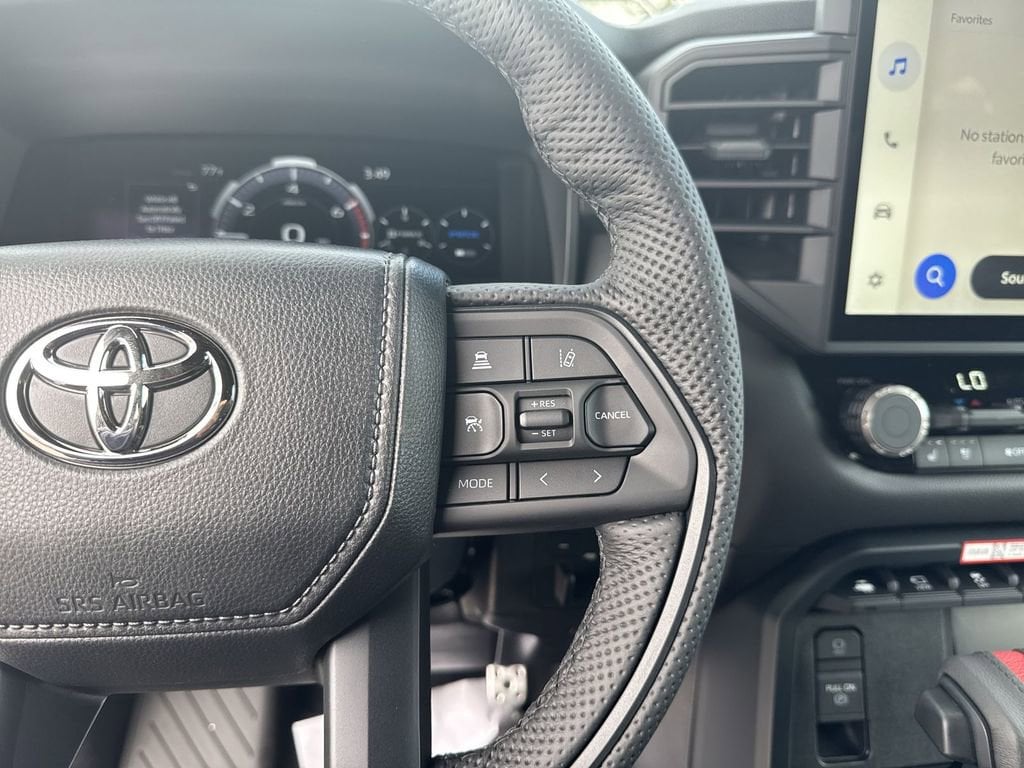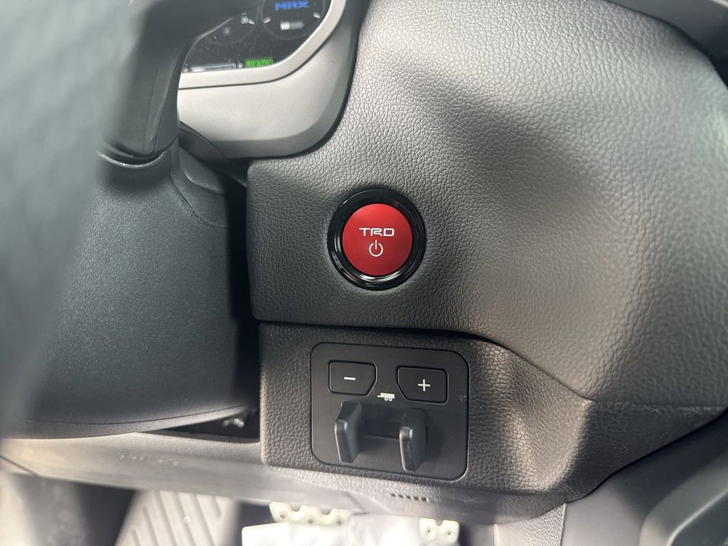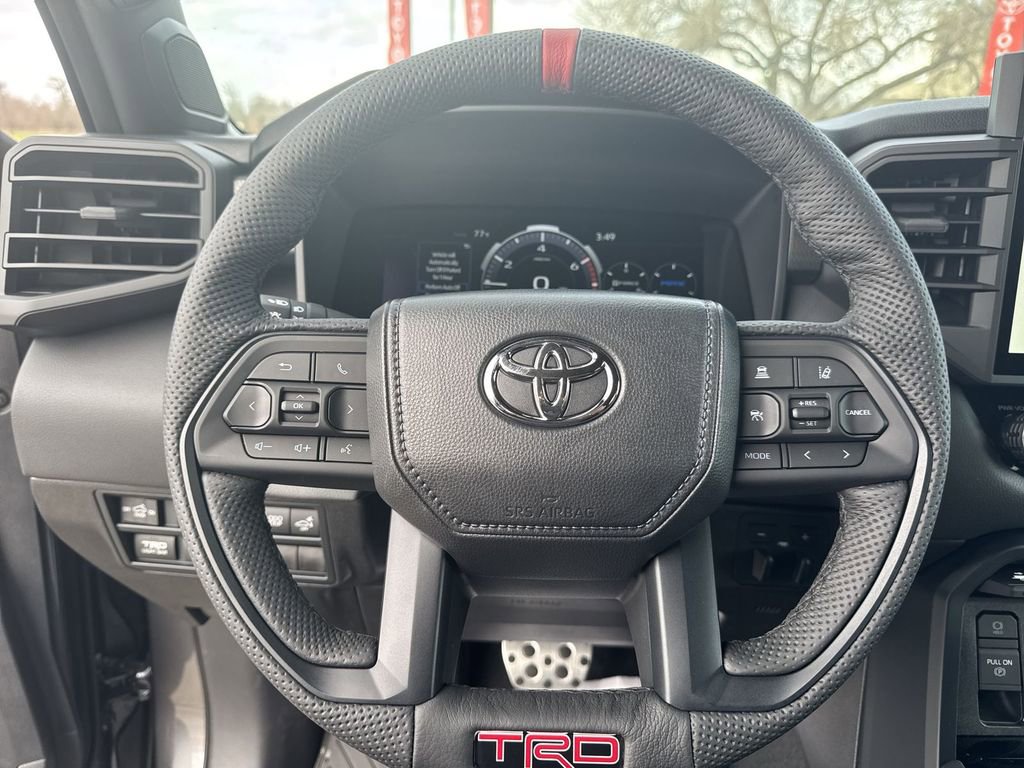 - TRD leather-wrapped manual tilt/telescopic steering wheel with TRD badge, red center stripe, and phone, audio, display/infotainment, and Driver Assist controls